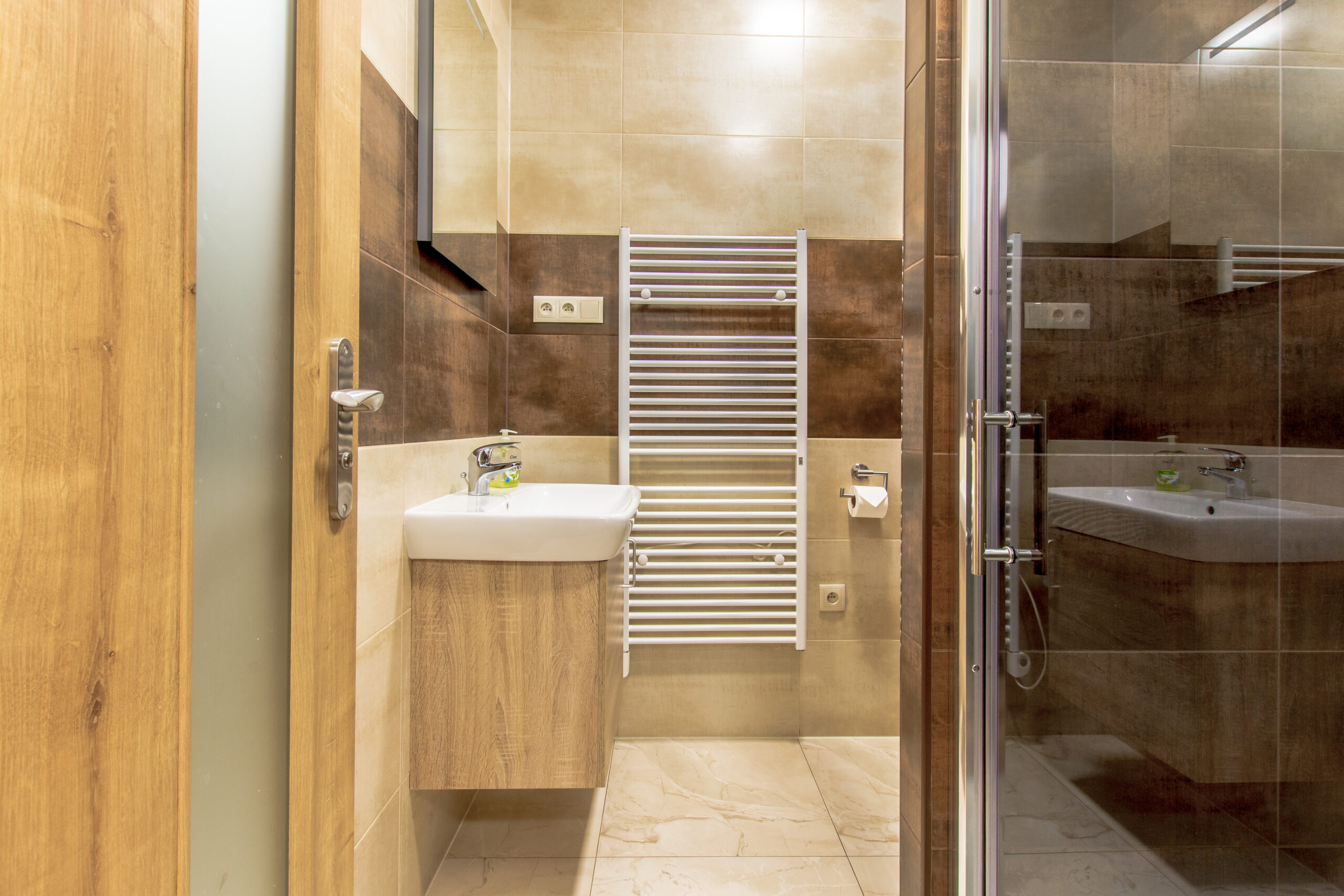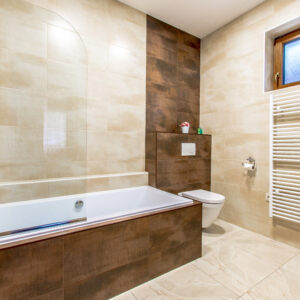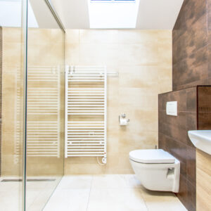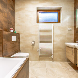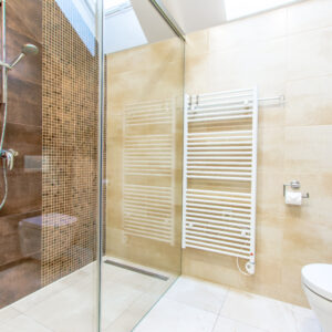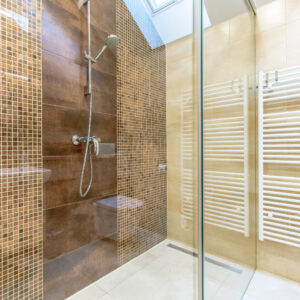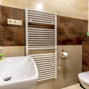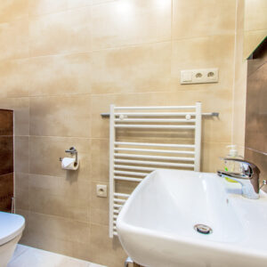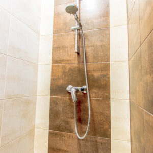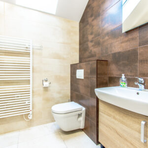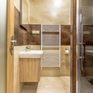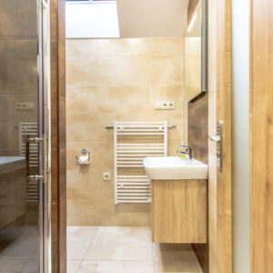 - Kúpelňa s veľkým sprchovacím kútom a WC